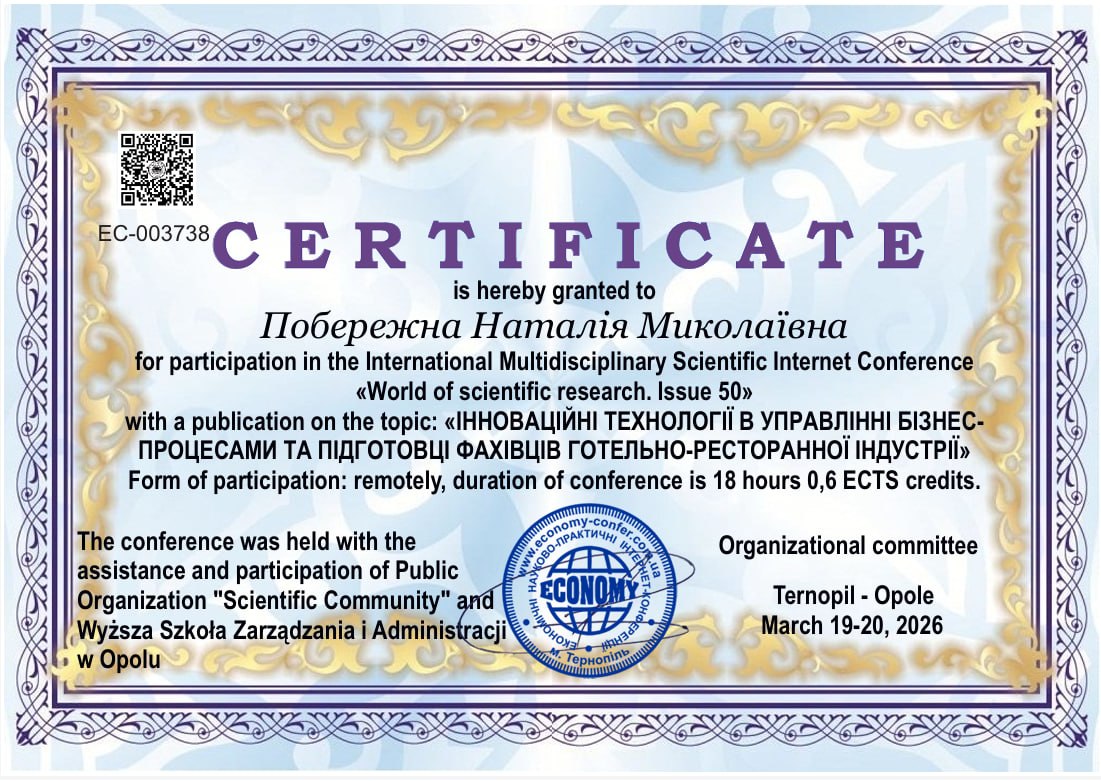 - участь у Міжнародній мультидисциплінарній науковій інтернет-конференції «Світ наукових досліджень. Вип. 50» з публікацією на тему: «Інноваційні технології в управлінні бізнес-процесами та підготовці фахівців готельно-ресторанної індустрії», ГО «Наукова спільнота», Вища школа управління та адміністрації в Ополе, Тернопіль – Ополе, 19–20 березня 2026 року, 18 годин / 0,6 кредиту ЄКТС (сертифікат № EC-003738)