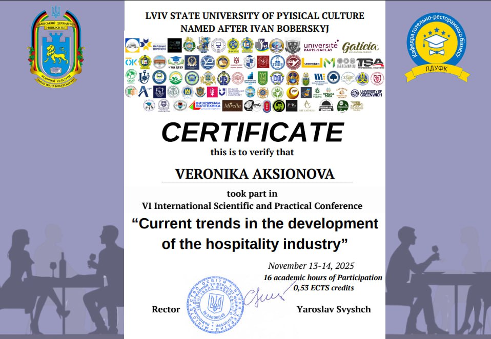 - Аксьонова Вероніка – участь у VI Міжнародній науково-практичній конференції «Сучасні тенденції розвитку індустрії гостинності», ЛДУФК ім. І. Боберського, 13-14 листопада 2025 року, 16 академічних годин, 0,53 кредитів ECTS (сертифікат)