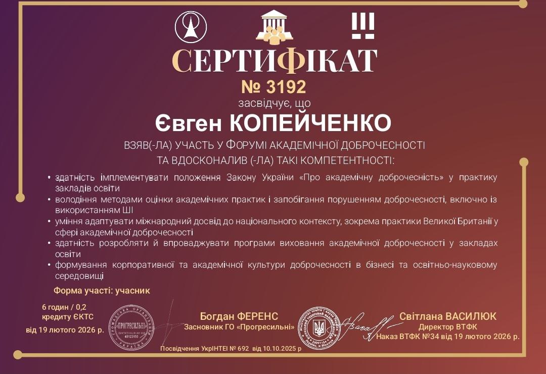 - Копейченко Євген – участь у Форумі академічної доброчесності, Вінницький технічний фаховий коледж, ГО «Прогресильні», 19 лютого 2026 р. (сертифікат № 3192)