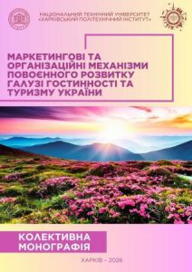 Маркетингові та організаційні механізми повоєнного розвитку галузі гостинності та туризму України : кол. монографія / За ред. Н. В. Якименко-Терещенко, Д. В. Райко, О. О. Носирєва. Харків : НТУ «ХПІ», 2026. 960 с. DOI: 10.20998/978-617-05-0580-4