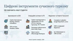 У рамках навчальних дисциплін, що викладаються на кафедрі туризму і готельно-ресторанного бізнесу, студенти спеціальності «Туризм і рекреація» активно опановують сучасні цифрові інструменти, необхідні для професійної діяльності в туристичній сфері. Серед ключових напрямів підготовки – практичне використання програмного забезпечення та онлайн-сервісів, Читати далі