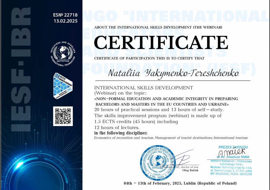 - стажування за тренувальною програмою «Сучасні тенденції розвитку індустрії гостинності», 09-10 квітня 2025 р., 1,0 кредит ЄКТС (сертифікат ЕГП-1108-2025)