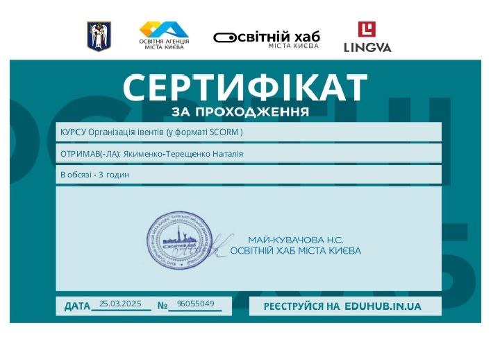 - проходження курсу «Організація івентів (у форматі SСORM)», освітній хаб міста Києва (сертифікат № 96055049 від 25.03.2025 р.)