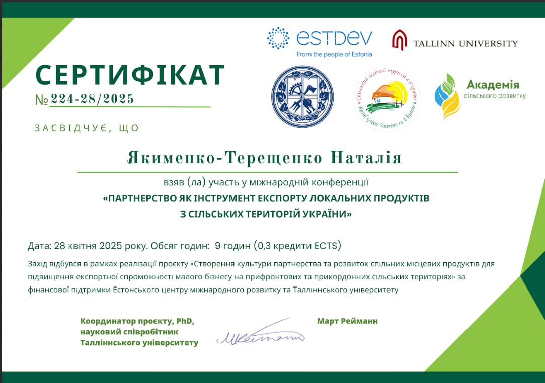 - участь у міжнародній конференції «Партнерство як інструмент експорту локальних продуктів з сільских територій України», 28 квітня 2025 року (сертифікат № 224-28/2025)