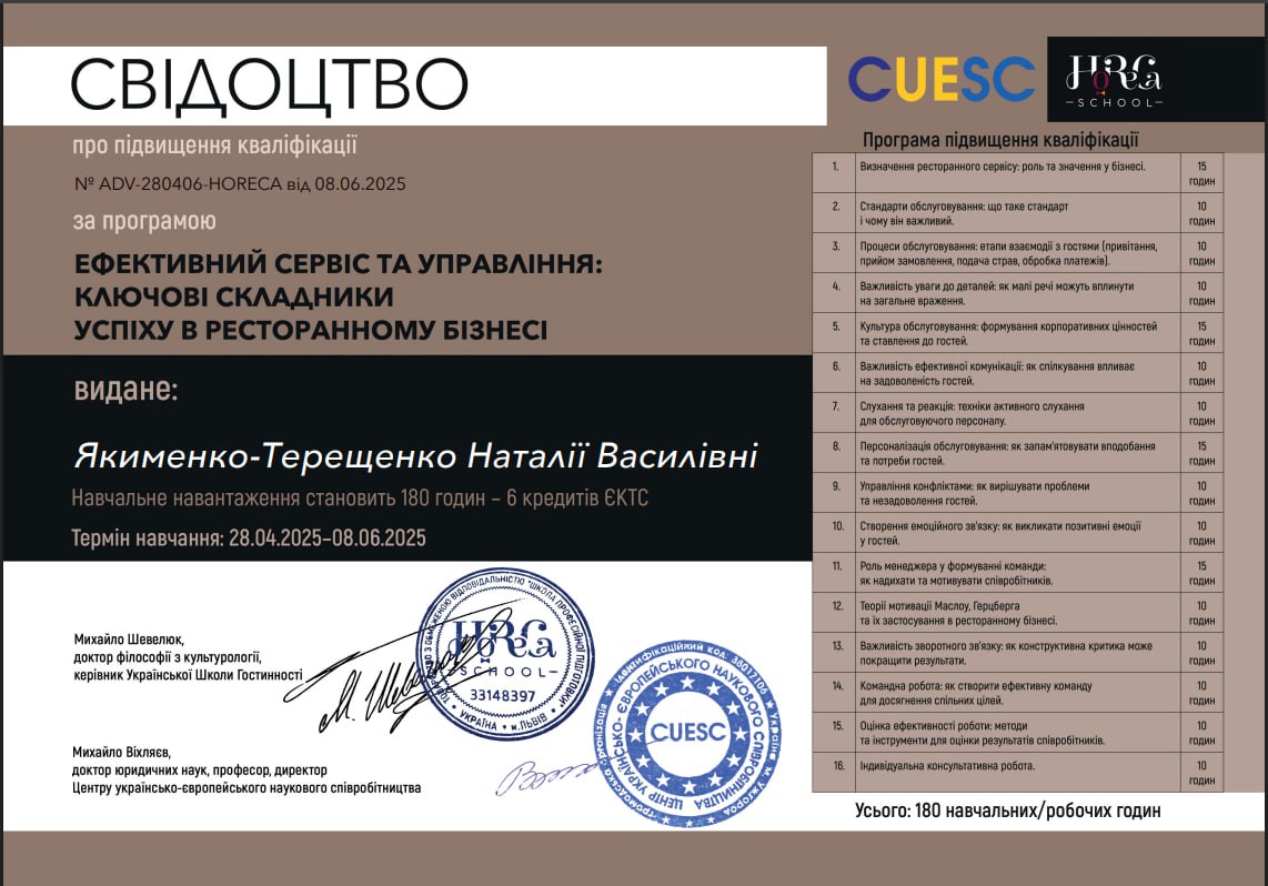 - підвищення кваліфікації за програмою «Ефективний сервіс та управління: ключові складники успіху в ресторанному бізнесі», Українська Школа Гостинності, Центр українсько-європейського наукового співробітництва, 28 квітня – 08 червня 2025 р., 6 кредитів ECTS (сертифікат № ADV-280406-HORECA від 08.06.2025 р.)