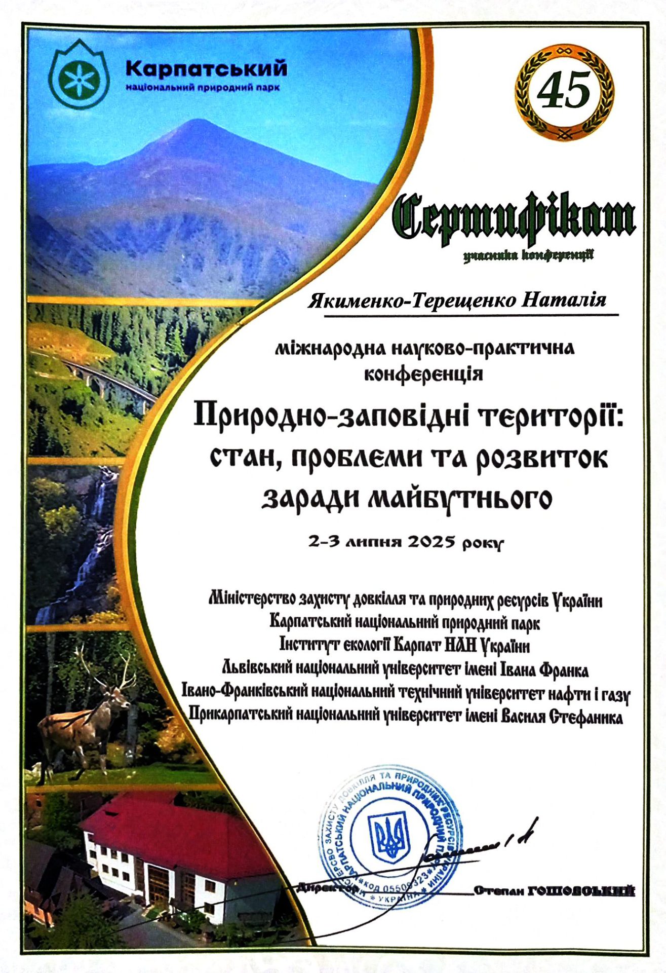 - участь в Міжнародній науково-практичній конференції «Природно-заповідні території: стан, проблеми та розвиток заради майбутнього», м. Яремче, Карпатський національний природний парк, 02-03 липня 2025 р. (сертифікат)