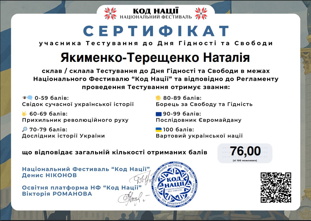 - успішне проходження тестування до Дня Гідності та Свободи, 2025 р. (сертифікат)