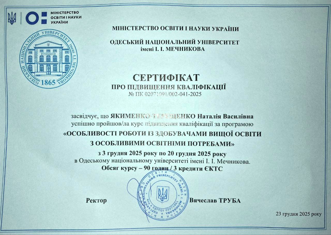 • проходження курсу підвищення кваліфікації за програмою «Особливості роботи із здобувачами вищої освіти з особливими освітніми потребами», Одеський національний університет імені І. І. Мечникова, 03-20 грудня 2025 року, 90 годин / 3 кредити ЄКТС (сертифікат № ПК 02071091/002-041-2025)