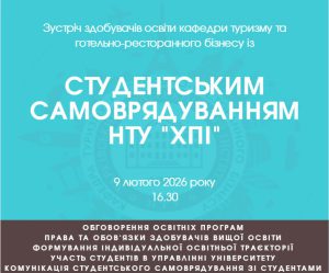 📣 Кафедра туризму та готельно-ресторанного бізнесу запрошує здобувачів вищої освіти на зустріч зі Студентським самоврядуванням НТУ «ХПІ».