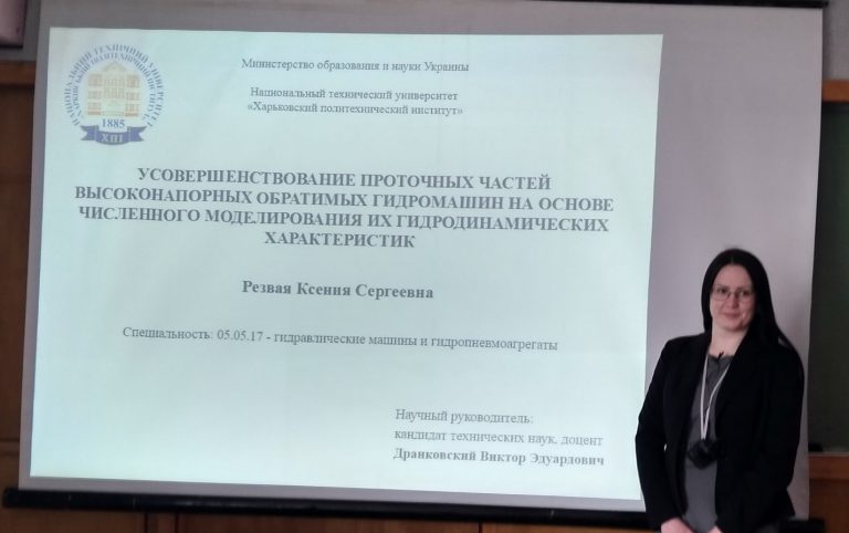 11 квітня на кафедрі турбінобудування відбувся захист дисертації на здобуття наукового ступеня кандидата технічних наук: Рєзвой Ксенії Сергіївни (асистента кафедри гідравлічних машин ім. Г.Ф. Проскури НТУ «ХПІ»). Тема: «Удосконалення проточних частин високонапірних оборотних гідромашин на основі чисельного моделювання їх гідродинамічних характеристик».