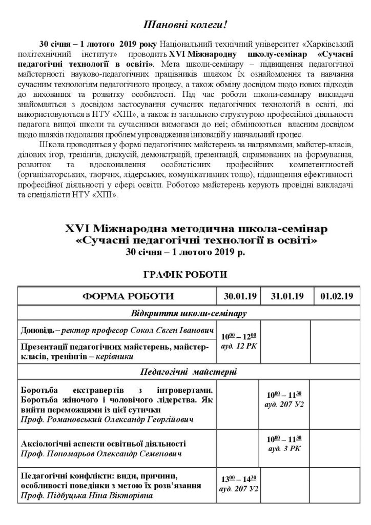 Хотите поделиться собственным педагогическим опытом и методиками? Или узнать о новациях в образовательных технологиях и усовершенствовать свое педагогическое мастерство? Тогда для Вас 30 января – 1 февраля в НТУ “ХПИ” состоится XVI Международная школа-семинар “Современные педагогические технологии в образовании”. Приглашаем к участию!