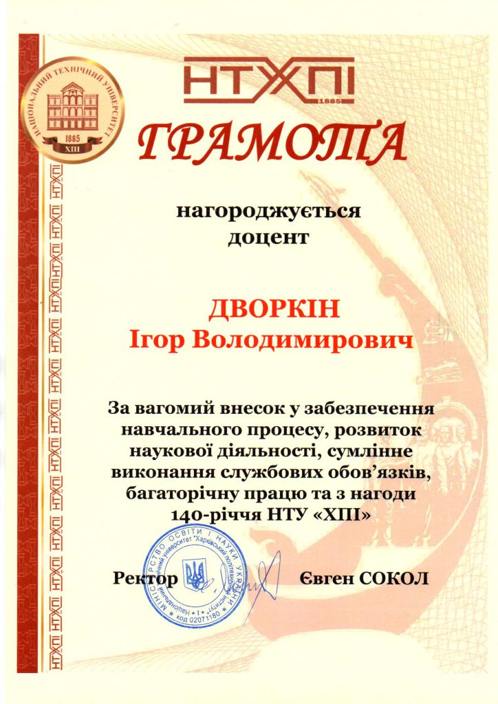 За вагомий внесок у забезпечення навчального процесу, розвиток наукової діяльності, сумлінне виконання службових обов’язків, багаторічну працю та з нагоди 140-річчя НТУ “ХПІ” грамотою нагороджується доцент кафедри українознавства, культурології та історії науки Дворкін Ігор Володимирович. Вітаємо з почесною і заслуженою нагородою!