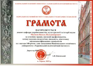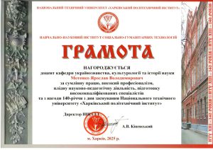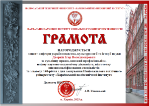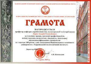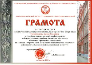 Директор ННІ соціально-гуманітарних технологій проф. Андрій Володимирович Кіпенський нагородив за сумлінну працю, високий професіоналізм, плідну науково-педагогічну діяльність, підготовку висококваліфікованих кадрів та з нагоди 140-річчя з дня заснування Національного технічного університету “Харківський політехнічний інститут” завідувачку кафедри українознавства, культурології та історії науки Олену Євгенівну Тверитникову, доцентів кафедри Ігоря Володимировича Дворкіна, Марину Валеріївну Гутник, Андрія Олексійовича Ларіна, Василя Володимировича Малікова, Ярослава Володимировича Мотенка, Наталю Володимирівну Фрадкіну. Колектив кафедри вітає 140-річчя НТУ “ХПІ”!
