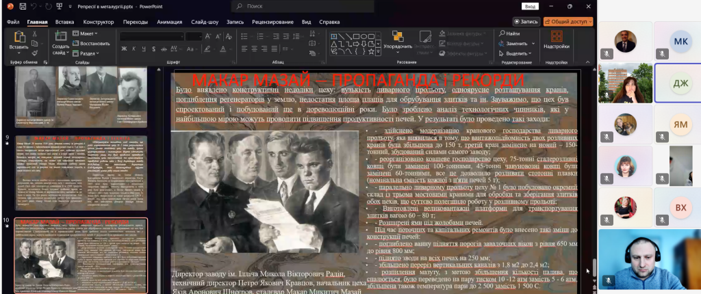 3 лютого 2026 р. відбувся науково-методичний семінар кафедри УКІН. Із доповіддю “Втрати вітчизняної промисловості в часи Великого терору на прикладі металургії” виступив доцент Дмитро Юрійович Журило. Представлена доповідь є корсиною як для істориків-досідників історії науки і техніки та історії України 1920-1930-х рр, її матеріали можуть бути використані у викладанні історичних дисциплін в НТУ “ХПІ”.