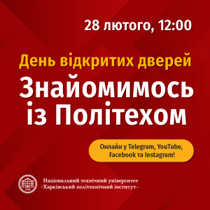 НТУ «ХПІ» запрошує учнів, батьків і педагогів на онлайн День відкритих дверей «Знайомимось із Політехом», який відбудеться у форматі єдиної трансляції з ключових локацій університету.