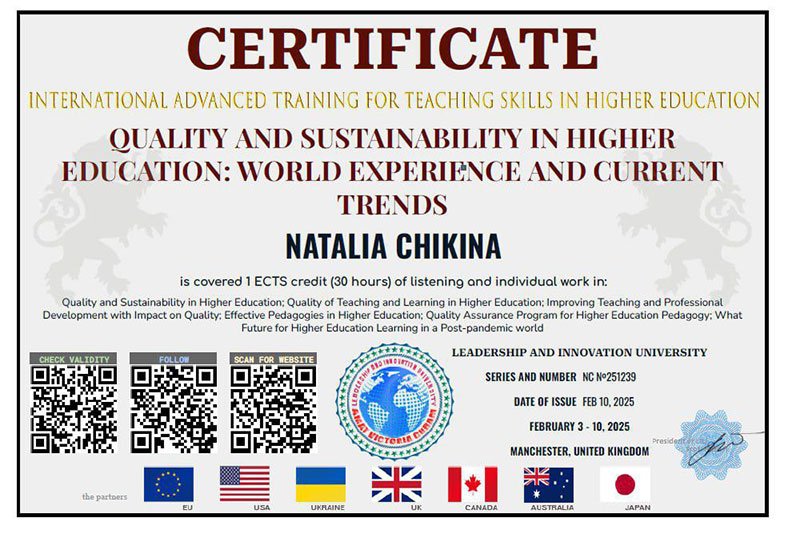 Certificate NС № 251239 (10.02.2025) on participation in the International Advanced Training Course for Higher Education Teachers on the topic: “QUALITY AND SUSTAINABILITY IN HIGHER EDUCATION: GLOBAL EXPERIENCE AND CURRENT TRENDS“