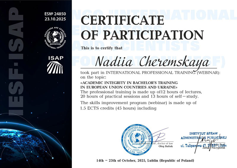 Сертифікат NS №24850 (23.10.2025) про участь у Міжнародному професійному навчанні (вебінар) на тему: «АКАДЕМІЧНА ДОБРОЧЕСНІСТЬ У ПІДГОТОВЦІ БАКАЛАВРІВ У КРАЇНАХ ЄВРОПЕЙСЬКОГО СОЮЗУ ТА УКРАЇНІ»