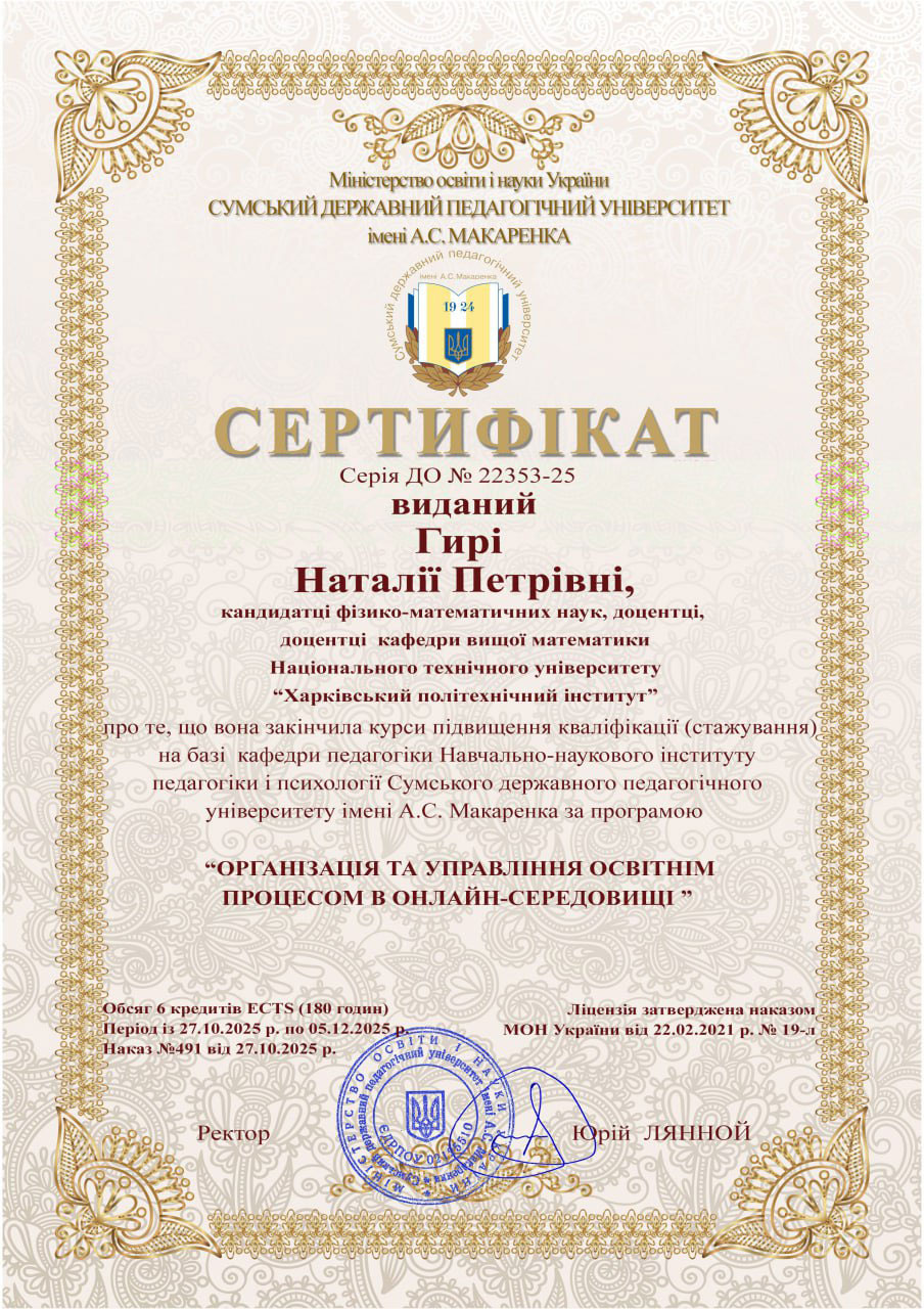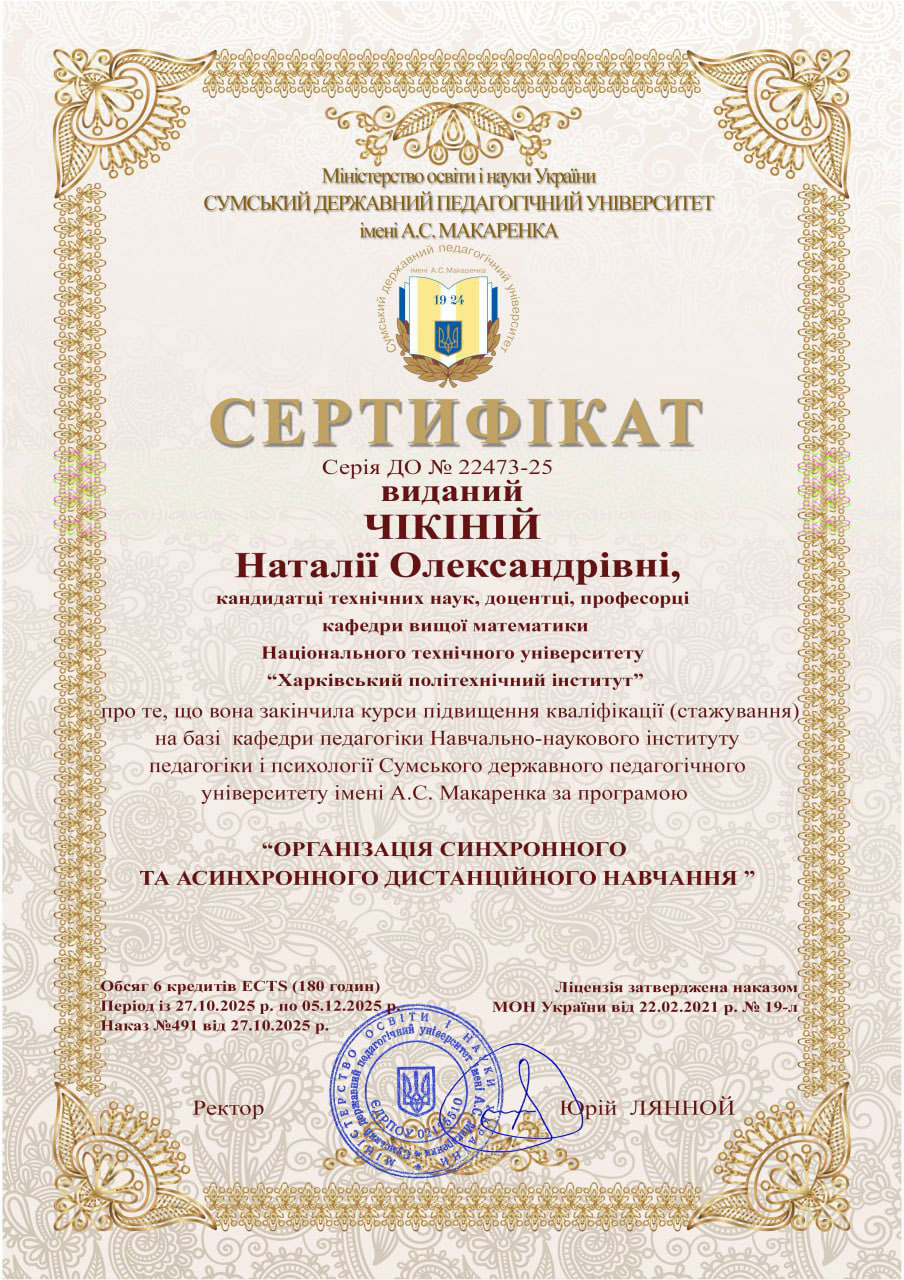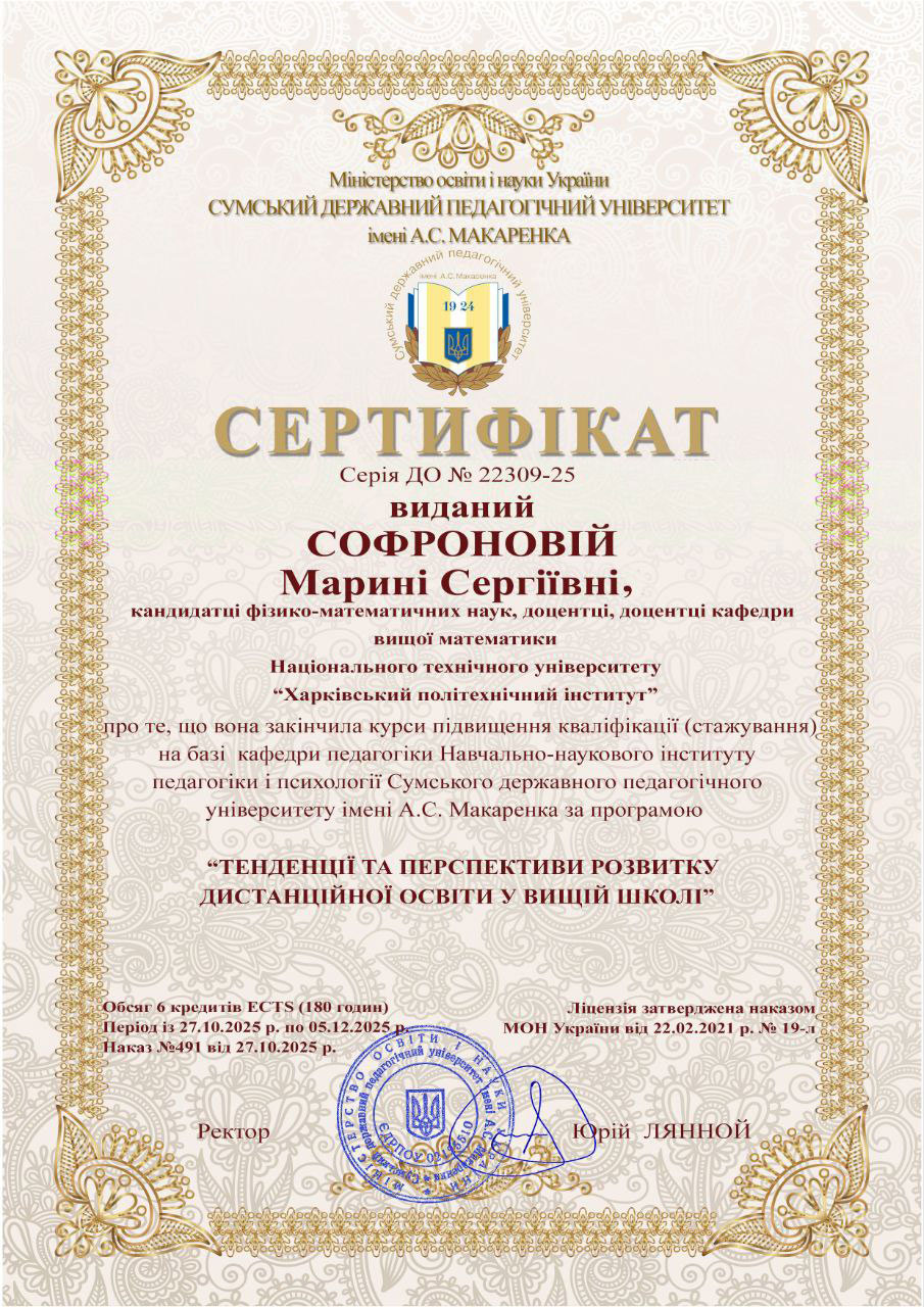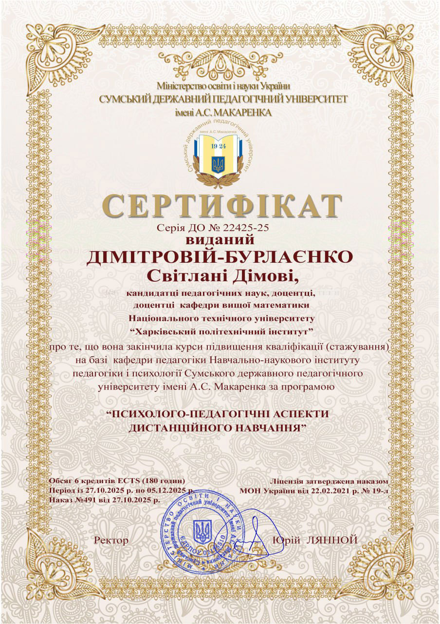 Стажування в Сумському державному педагогічному університеті імені А.С. Макаренка терміном 6 тижнів (180 годин/ 6 кредитів) з 27.10.2025 по 05.12.2025 рр. співробітниками кафедри: доктором фізико-математичних наук, завідувачем кафедри Першиною Ю.І.; кандидатом технічних наук, професором Чікіною Н.О.; доктором технічних наук, професором Тулученко Г.Я.; кандидатом технічних наук, доцентом Антоновою І.В.; кандидатом педагогічних наук, доцентом Дімітровою-Бурлаєнко С.Д.; кандидатом фізико-математичних наук, доцентом Гирею Н.П., кандидатом фізико-математичних наук, доцентом Софроновою М.С.